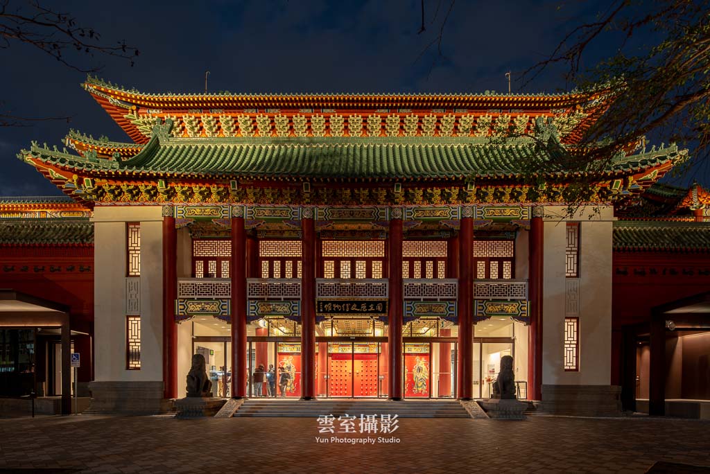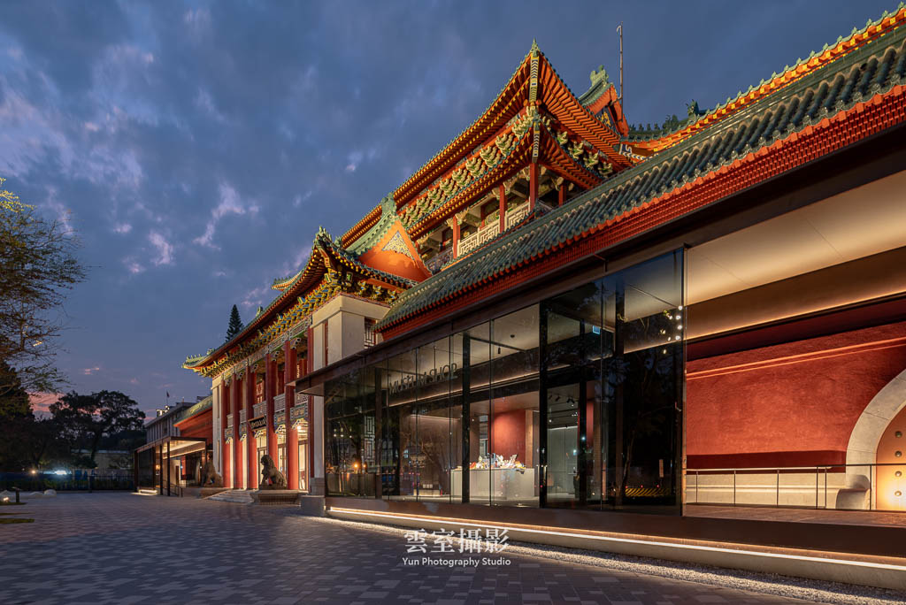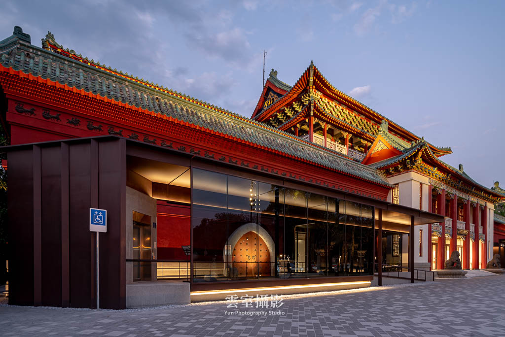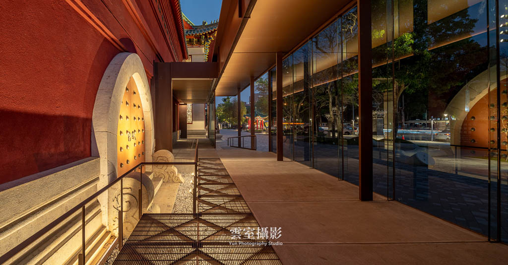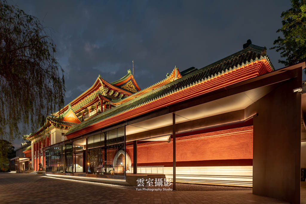 從構圖上,利用新擴建的走廊屋頂作為中軸線,形成紅色實牆-室外-半戶外走廊-室外,具有虛實、新舊對比的畫面,到夜間照明亮起後效果更為明顯。屋簷的高度從正立面上看不高於舊建築屋頂,透過玻璃幕牆也能隱約見到原建築的紅牆,達到新舊並存的視覺效果。